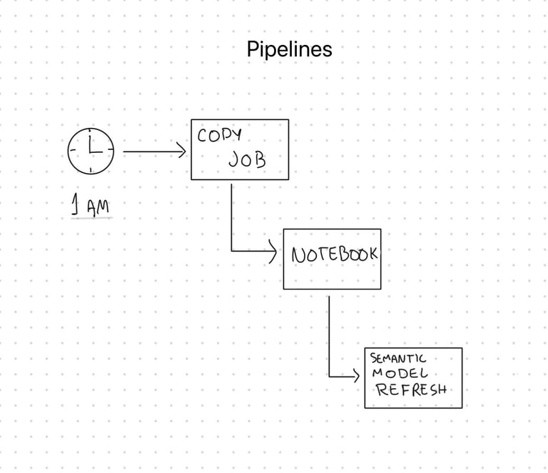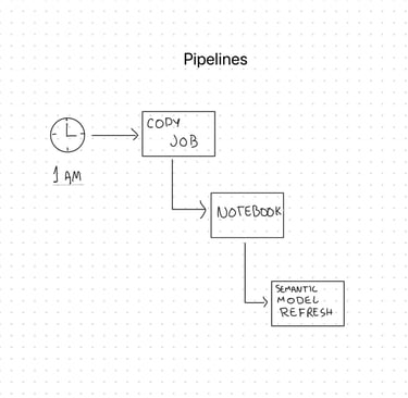 Um pipeline é composto de atividades. Cada atividade configurada em um pipeline é responsável por uma etapa do processo, desde (1) iniciar a extração dos dados de sistemas externos em um horário definido, (2) acionar um Notebook para realizar transformações e processamento das tabelas, até (3) atualizar o modelo semântico do Power BI.